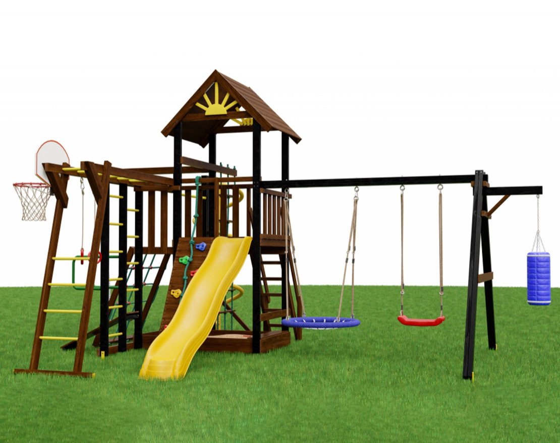 Комплекс помогает развивать все группы мышц, укрепляет здоровье и удерживает интерес надолго. Стойки выполнены из массива сосны, качели — из усиленного бруса 90×95 мм. Поверхности тщательно отшлифованы, дерево глубоко пропитано краской для защиты от влаги и солнца.