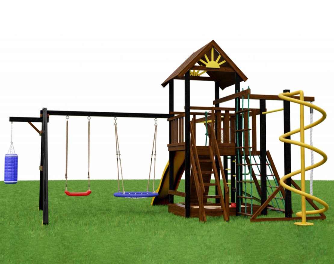 Хотите превратить двор в настоящий спортивный центр для ребёнка? С площадкой Айова 5 это реально. Модель объединяет десятки активностей — от лазания и качания до тренировки силы и координации. Среди элементов: шведская стенка, гимнастические кольца, брусья, сетка и даже оригинальная металлическая спираль, которая особенно нравится детям.