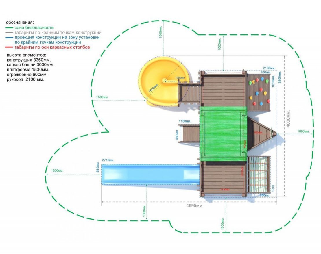 Для безопасной эксплуатации конструкции, площадка должна быть свободна от зеленых насаждений, сооружений и других конструкций, ровная, без перепадов уровня, без впадин и насыпей. Габариты площадки с учетом зоны безопасности длина 7695мм. ширина 7000мм., площадь площадки S-53,8м². Запрещено устанавливать конструкцию в зонах с повышенным риском провалов в грунте (болотистая местность, береговая линия водоемов, в непосредственной близости с оврагами и обрывами).