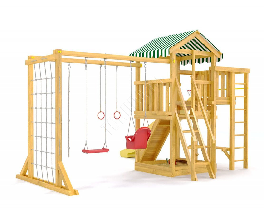 В основе натуральный материал – клееный брус 75х75 мм. Конструкция и элементы качельных подвесов разработаны и произведены согласно ГОСТ.