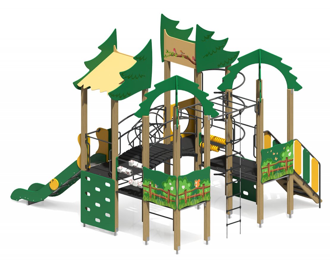 • Особенности комплектации: верёвочная лестница, рукоход, горка, скалодром, счеты, лестница, кольцевой лаз