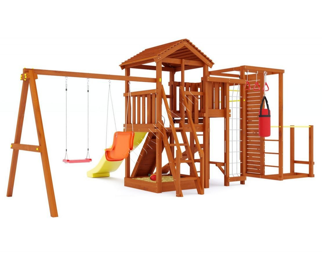 Высокая прочность конструкции и использование материалов высокого качества делают этот комплекс очень долговечным и безопасным. Вся древесина проходит качественную обработку и имеет сертификат безопасности. Металлические детали комплекса усилены, а качельный подвес из оцинкованной стали не будет ржаветь во время эксплуатации. Установленные не снимаемые пластиковые заглушки делают комплекс безопасным и аккуратным внешне.