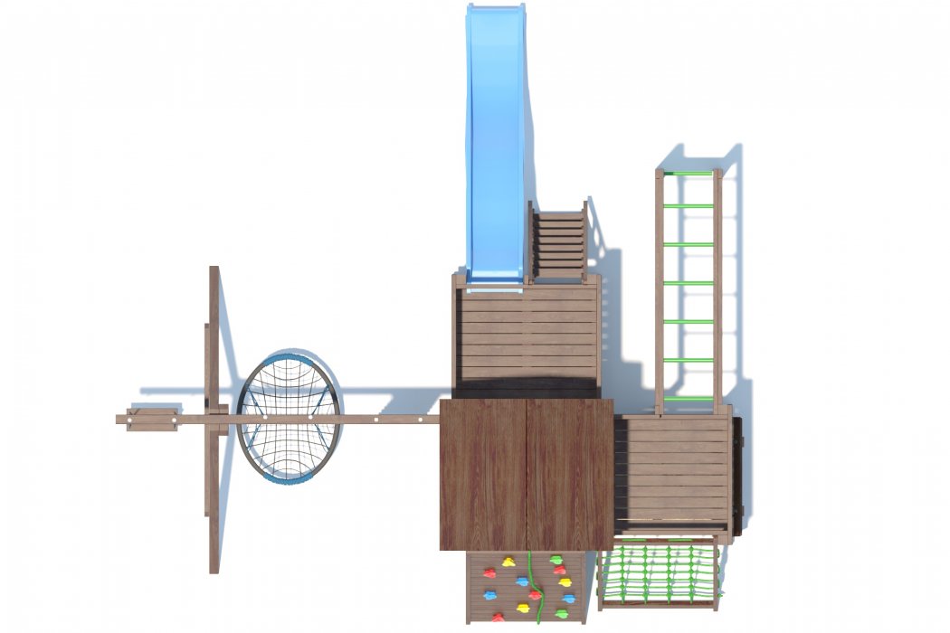 Основа детской игровой - спортивной конструкции - башня с террасой и игровой платформой. Конструкция оснащена двускатной деревянной крышей, встроенным домиком в нижней части конструкции, пристроенной к домику песочницей с крышкой «трансформер», дополнительной платформой в основании конструкции, пластиковым волнообразным скатом с превосходной скользящей поверхностью, деревянной лестницей, широким скалодромом, канатной лестницей, деревянным рукоходом, приставными качелями, сидением качели «гнездо», сидением качели, подвесной лестницей. Для безопасности ребенка предусмотрены перила на лестнице, заборчики и ограждения над зонами препятствий (скалодром, канатная лестница, скат).