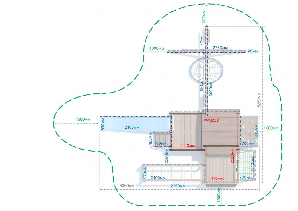 Площадь поверхности детской площадки = габариты конструкции по крайним точкам + 1000/1500мм. по периметру конструкции. Поверхность должна быть твердой, ровной, свободной от насаждений, горизонтальной без перепадов, допустимый уклон не более 20мм. на 10п.м.