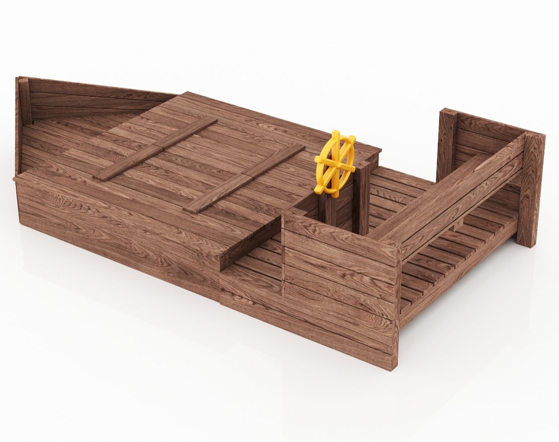 Детская песочница-кораблик и штурманская рубка со штурвалом.