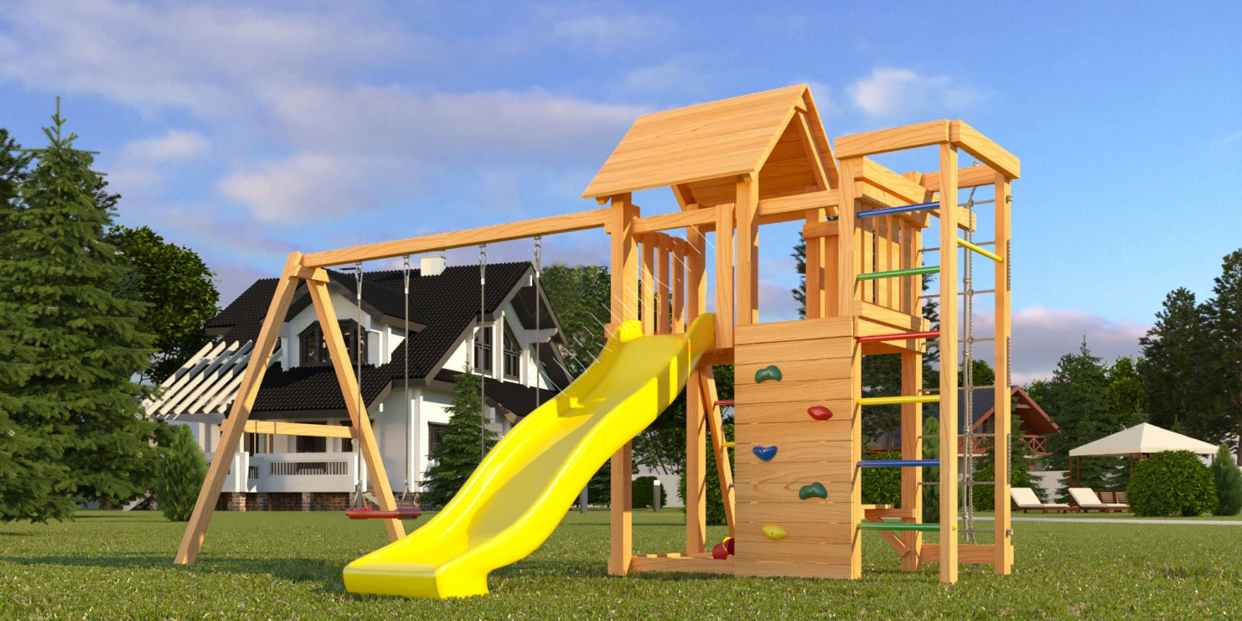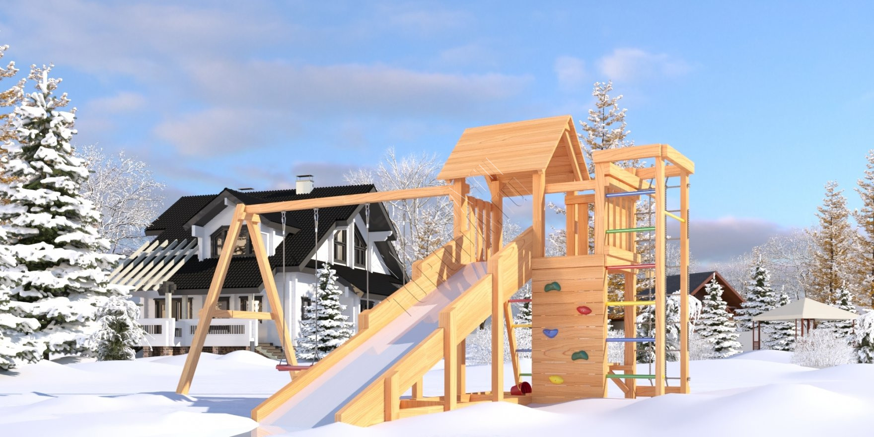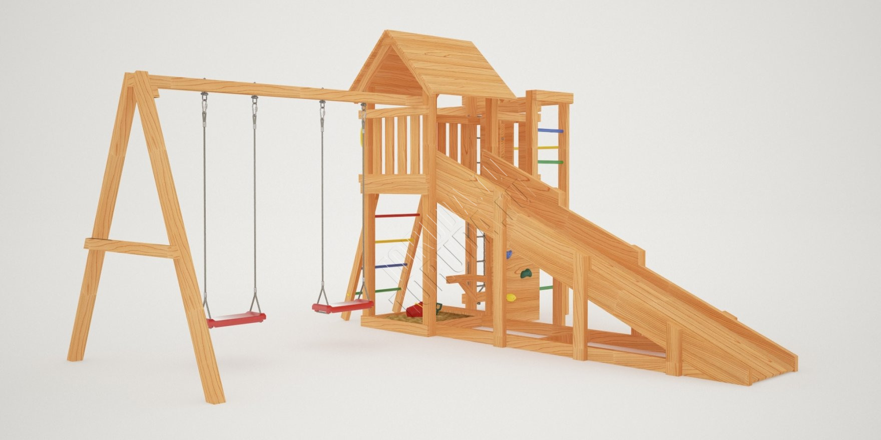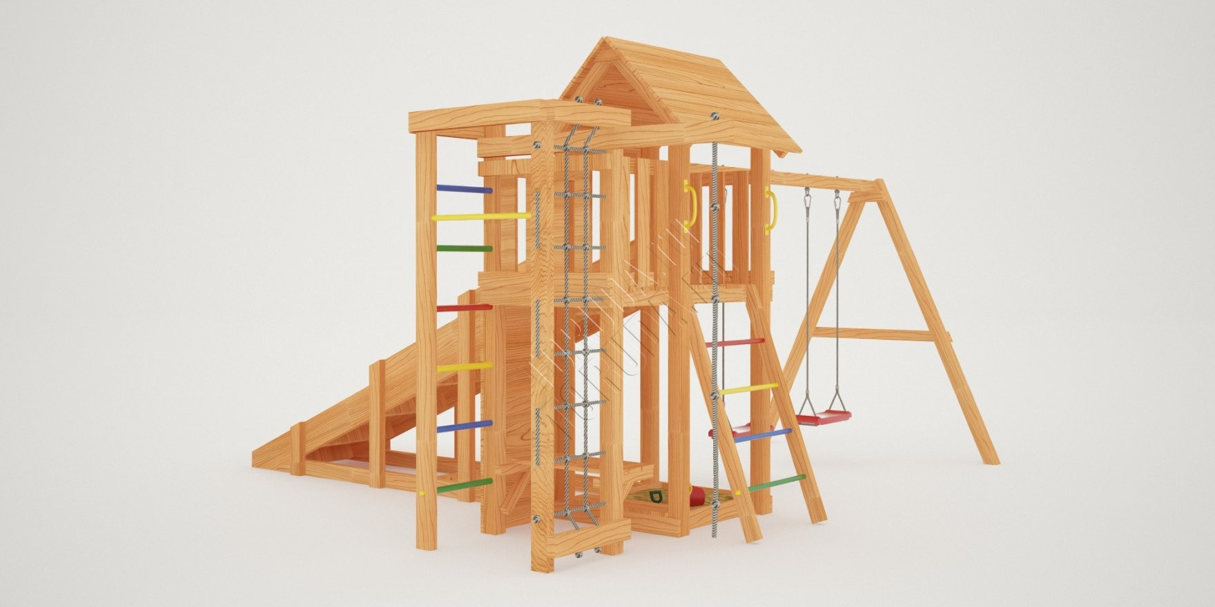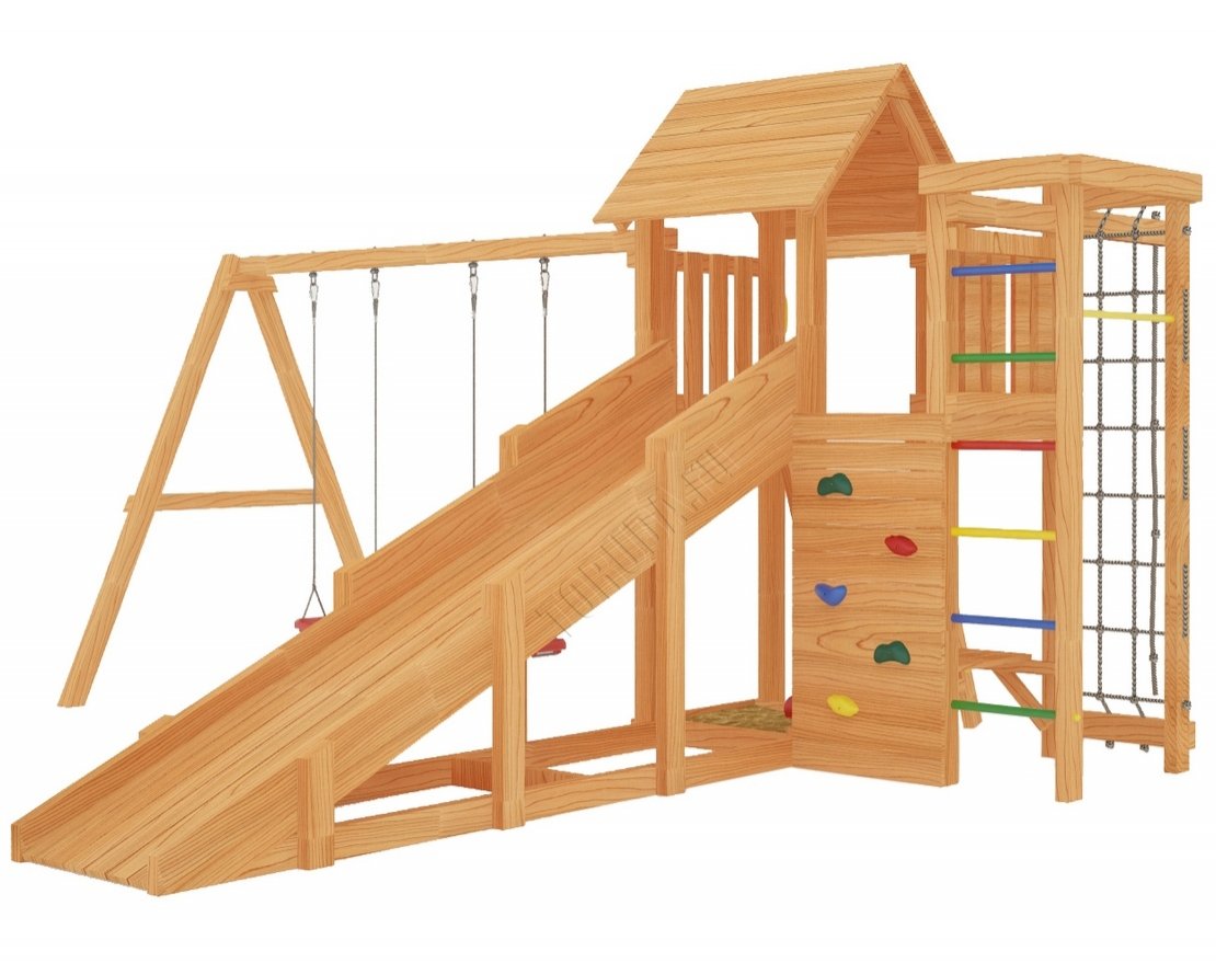 Комплекс безопасен – конструкция, качество древесины и подвижных элементов соответствуют ГОСТ. Основным материалом является экологичный клееный брус, балки которого отшлифованы и имеют закругленные края.