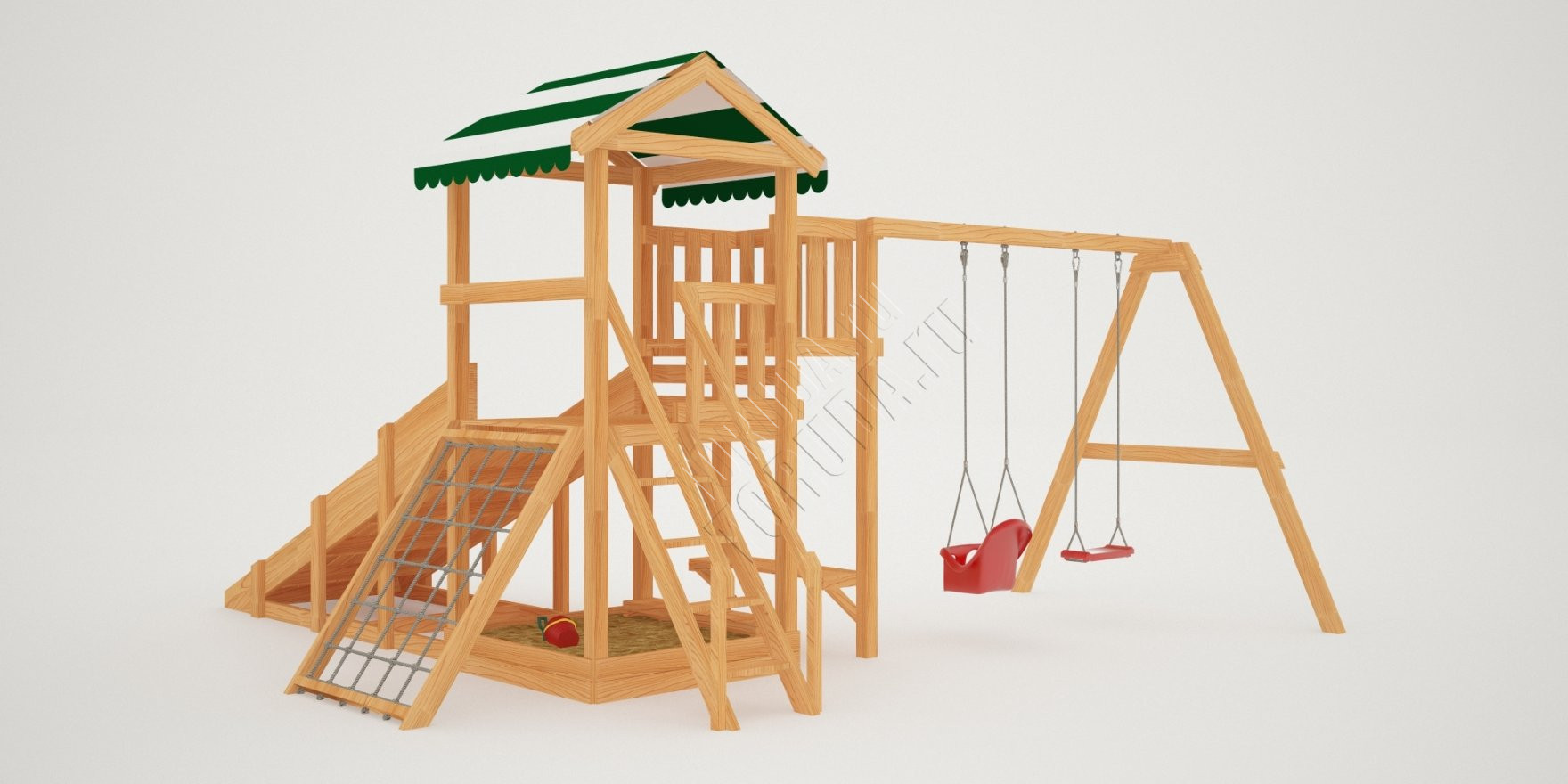 Поднявшись наверх можно поиграть на балкончике, с него будет открываться хороший вид на Ваш дачный участок. А быстро спуститься вниз малышам понравится с горки, цвет пластика на выбор: красный, желтый, зеленый, синий. Под платформой расположена квадратная песочница со сторонами 129 см, где можно более спокойно провести время, а отдохнуть на деревянной лавочке.