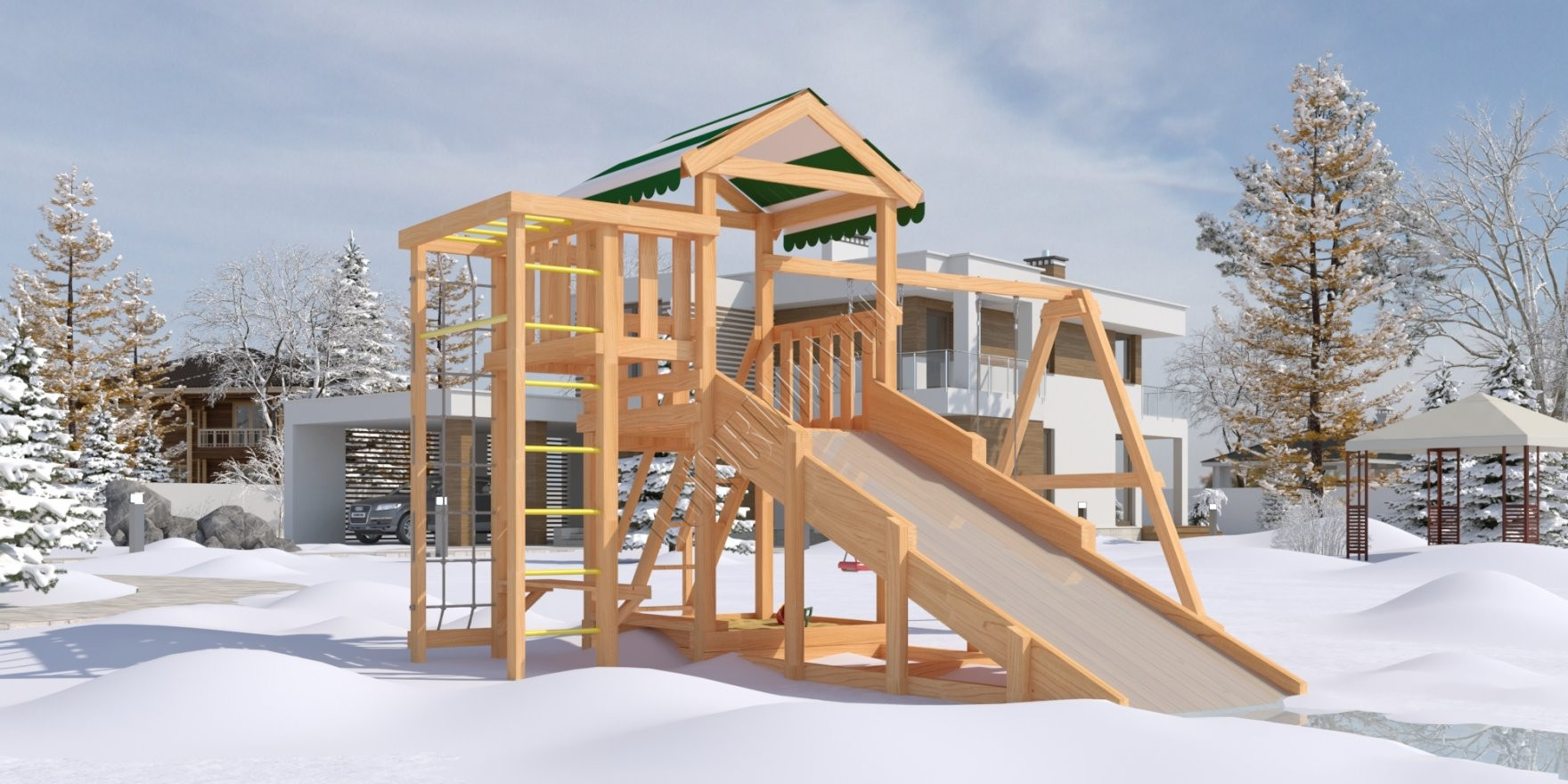 Конструкция сертифицирована и безопасна. Крепежи скрыты под хорошо закрепленными заглушками – поэтому даже малыши не поранятся. Каркас состоит из натуральных деталей – клееного бруса квадратного сечения со стороной 75 мм. Во избежание получения заноз и ссадин дерево отшлифовано, а края скруглены. Материал экологичен и не имеет лакокрасочного покрытия.