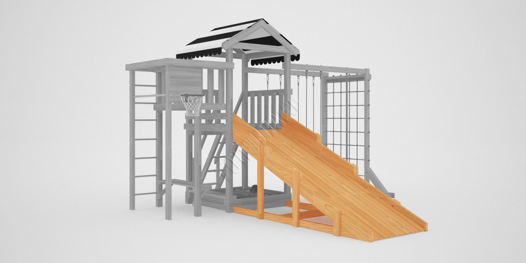 Укреплять мышечный каркас нужно с детства, бросая мяч в баскетбольное кольцо, вися на турнике и кольцах, карабкаясь по шведской стенке, канату, сетке-лазалке. Все это многообразие спортивных снарядов присутствует в этой площадке. Для большей радости качели «Лодочка» и «Люкс» со спинкой.