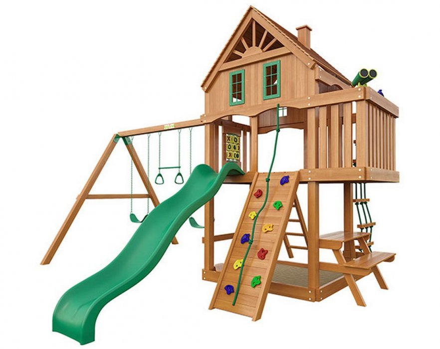 В основании "домика" расположена небольшая песочница для малышей и секция лавочка-стол. Второй уровень представлен просторной верандой с ограждением и интересной резной крышей с дымоходной трубой. Здесь же имеется развлекательная доска "крестики-нолики," штурвал и бинокль. Комплекс оснащен трехметровой волновой горкой, скалодромом с канатом и разноцветными камнями-уступами, классической и вертикальной веревочной лестницами.