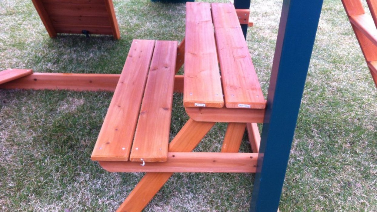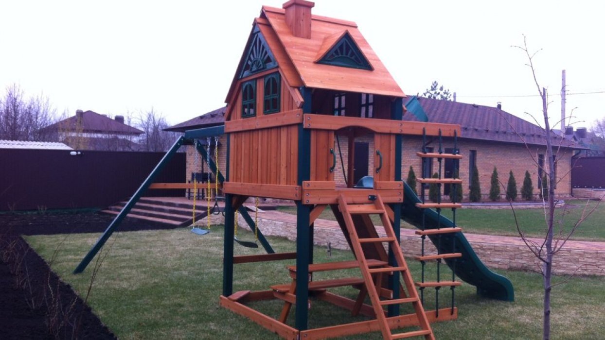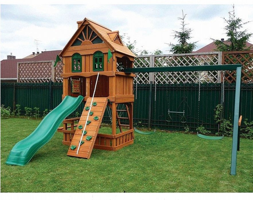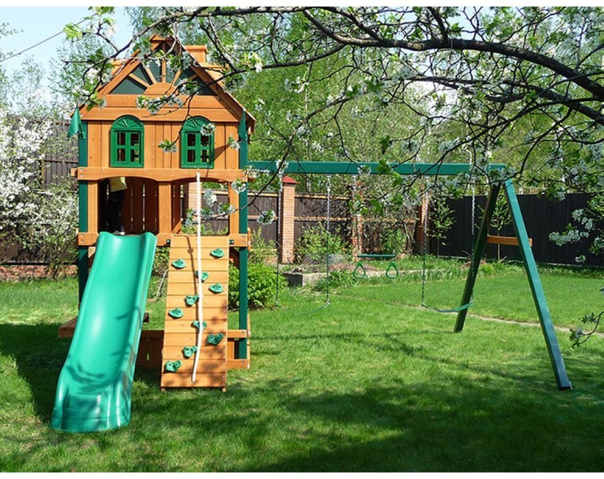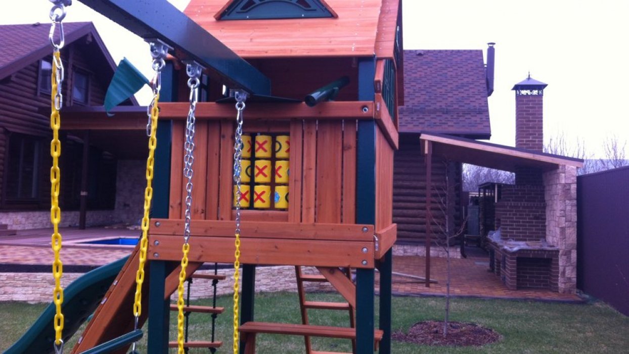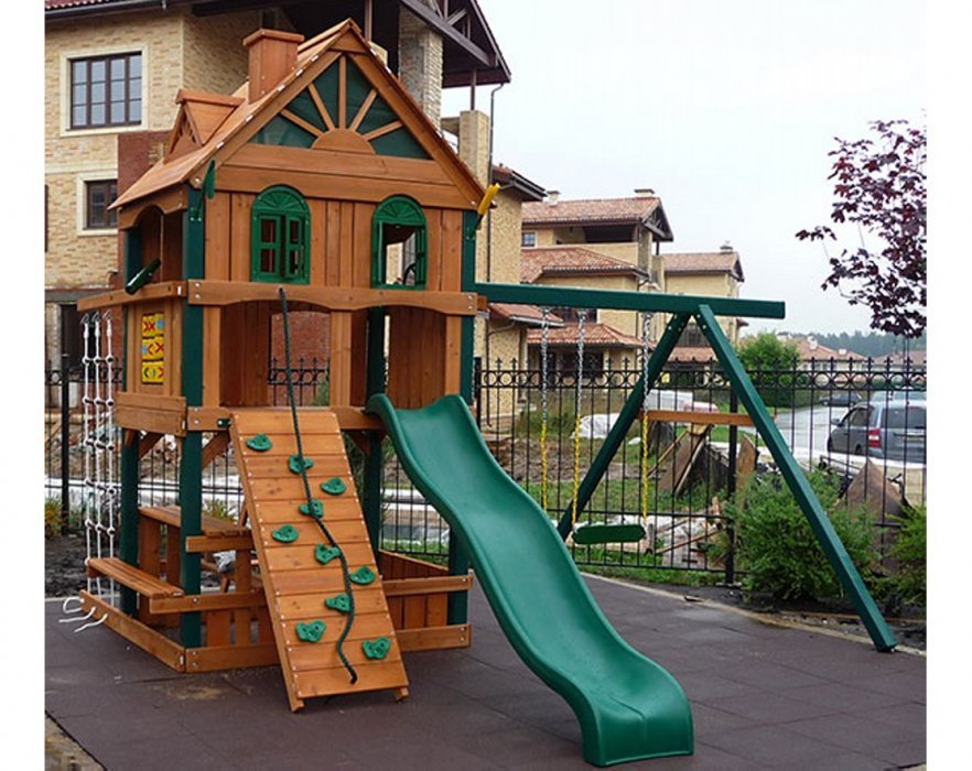 Детская игровая площадка Зоренька с большим деревянным фортом оснащен рулем, телескопом и перископом, флажками и колокольчиком. Дерево, из которого изготовлена детская площадка, пропитано специальным составом, защищающим от гниения, солнечных лучей и насекомых.