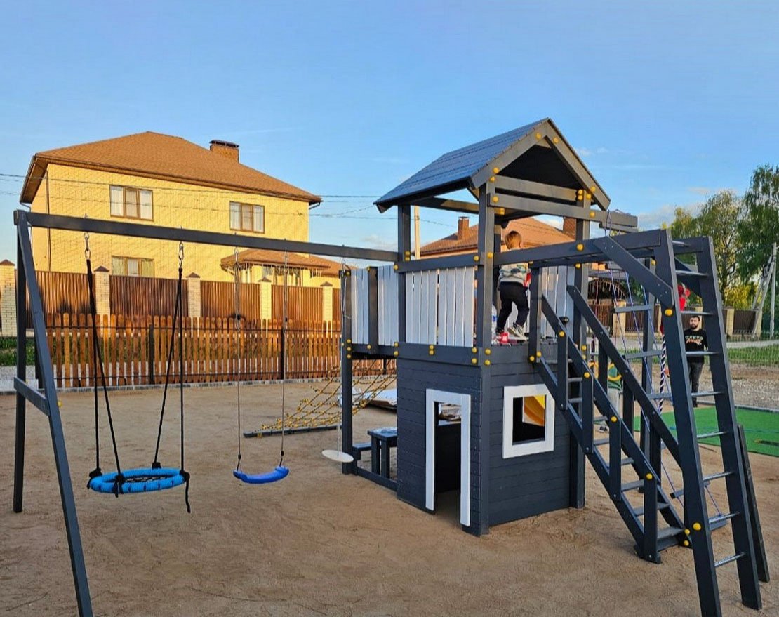 Максимально возможная комплектация в сочетании с турником, скамейками со столиком, домиком с окошками (теремок), в комплекте большая паутинка и пиратская лестница. Детская площадка в полной комплектации позволит вашим детям разнообразить свои игры на свежем воздухе, а так же пригласить своих друзей для веселого времяпрепровождения. Места хватит всем!