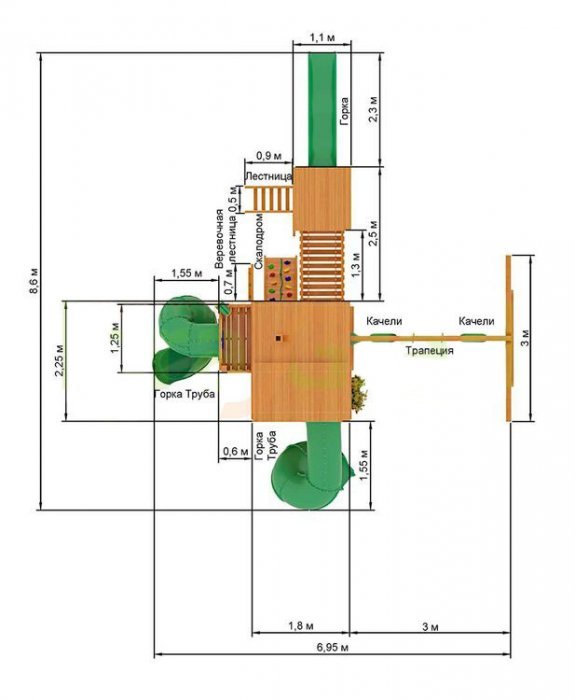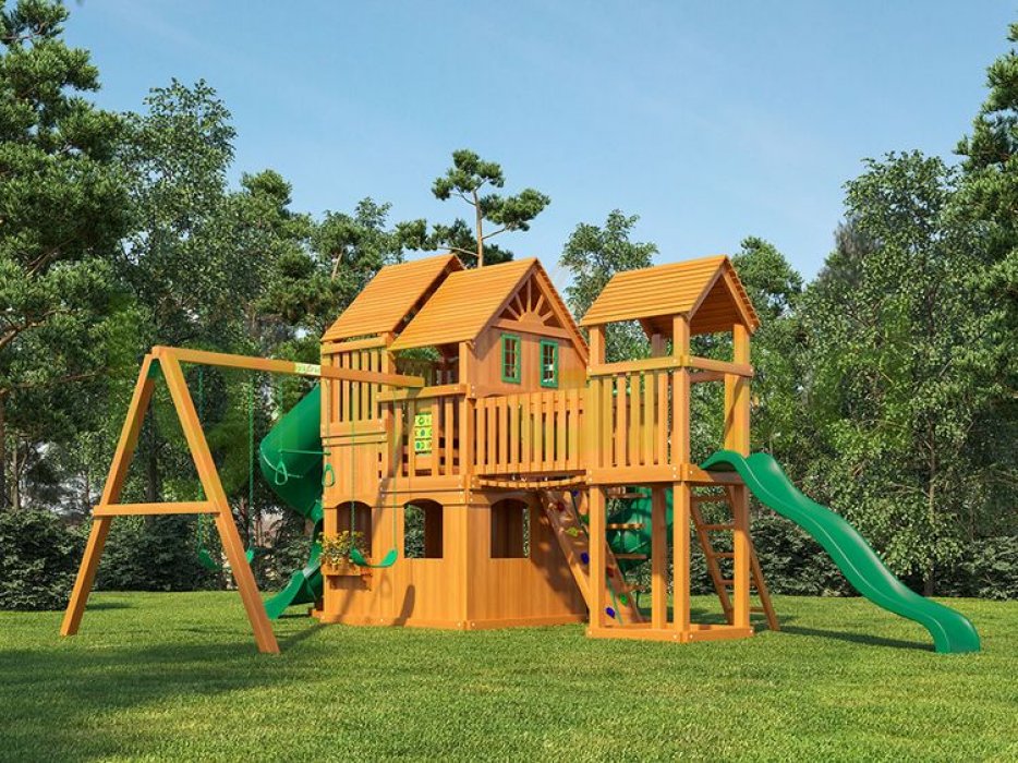 Родители могут быть спокойны за своих малышей, ведь комплекс обладает высокой степенью безопасности с усиленными комплектующими. Деревянные элементы обработаны антисептиком, препятствующим порче материала, так что эта красивая площадка будет радовать ваших детей очень долго.