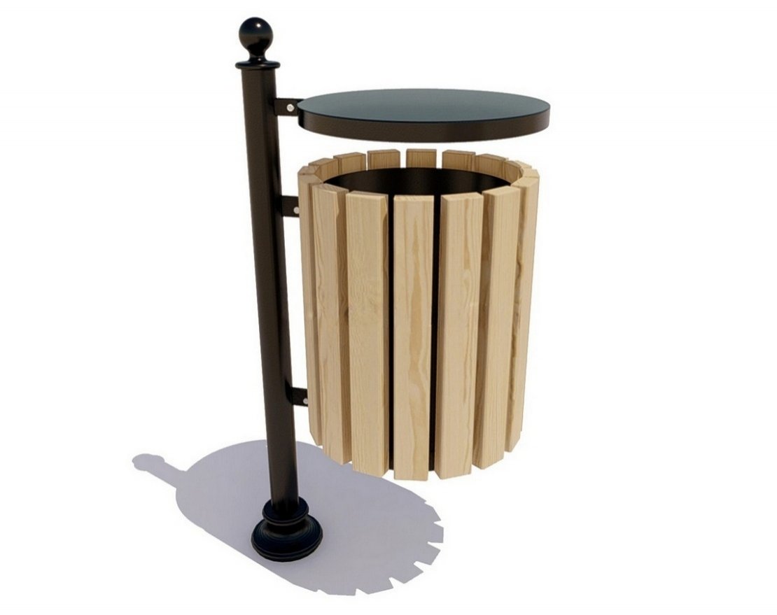 Чугунный каркас урны «Арчи» — прочный и долговечный. Отделка вертикальными сосновыми рейками придает урне эстетичный вид, крышка защищает от наполнения водой или снегом в непогоду.