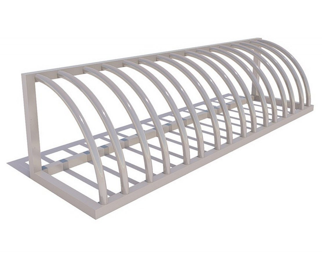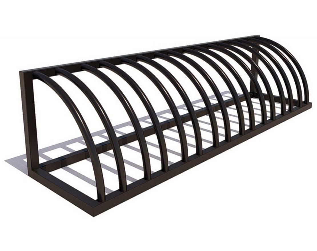 Велопарковка – это стальная конструкция с массивным прямоугольным основанием. Ячейки имеют полукруглую форму, секции для велосипедов чередуются с узкими разделительными блоками. Конструкция отличается небольшими размерами, легко умещается вдоль стен за счет плоской каркасной части сзади и устойчива на любой поверхности. Для окраски используется специальное износоустойчивое покрытие. Сплошные элементы отсутствуют, поверхность легко моется и не выцветает на солнце. За счет массивного основания парковка не требует закрепления, практична и удобна в использовании.